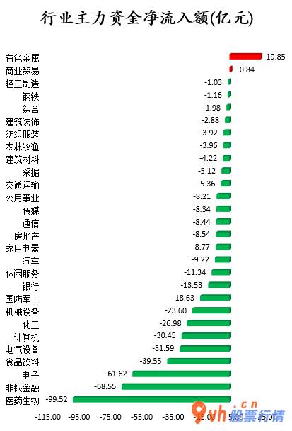从行业版块看来,申万所属的28个一级行业,仅有有色金属(512400)、商业贸易2个行业版块主力资金展现净流入,净流入金额分别为19.85亿元、0.84亿元。26个行业版块主力资金展现净流出,其中,医药生物行业版块主力资金净流出最多,净流出金额为99.52亿元;行业版块主力资金净流出靠前的还有非银金融、电子、食品饮料、电气设备、计算机(512720),净流出金额分别为68.55亿元、61.62亿元、39.55亿元、31.59亿元、30.45亿元。