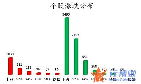 截至收盘,沪深两市合计1030只股票上涨,3490只股票下挫,平盘股票66只,停牌的股票9只。不含当日上市新股,共有59只股票涨停,46只股票跌停。股票行情查询网站