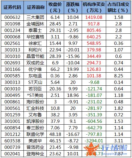 盘后龙虎榜数据显示,今天机构席位资金合计净卖出约1.57亿元。其中,净买入的股票10只,净卖出的股票12只。机构净买入最多的股票是三木集团(000632),净买入金额约1419.08万元;机构净买入靠前的还有金埔园林、泰慕士等股。机构净卖出最多的股票是登海种业(002041),净卖出金额约8464.73万元。机构净卖出靠前的还有普洛药业(000739)、美诺华(603538)等股。