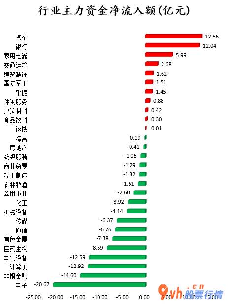 从领域版面来看,申万隶属的28个一级领域,有11个领域版面主力吸筹呈现资金净流入,在其中,轿车、金融机构、电器产品、道路运输、工程建筑装点领域版面主要主力资金流向靠前,资金净流入额度各自为12.56亿人民币、12.04亿人民币、5.99亿元、2.68亿人民币、1.62亿人民币;17个领域版面主力吸筹呈现净排出,在其中,电子器件、非银金融、电子计算机(512720)、电器设备、医药生物领域版面主力吸筹净排出较多,净排出额度各自为20.67亿人民币、14.六亿元、12.92亿人民币、12.59亿人民币、8.59亿人民币。