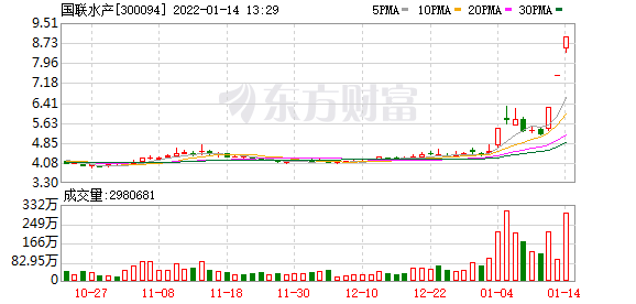 该消息一经公布,国联水产(300094)1月12日、1月13日斩获两个涨停板,实现年初以来的第三次涨停。2022年以来的8个交易日,该股累计上涨幅度达64.7%。