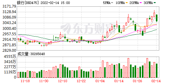 值得注意的是,盘中下滑靠前的银行多是前期上涨幅度较大银行。今年以来,随着银行业绩快报超预测,叠加宽信用利好银行资产质量与信贷需求,机构普遍看好具备低估值优势和避险特点的银行股。在销售市场回调中,银行股逆市摆脱独立行情,总体暴涨8%(同期沪深指数跌4.86%),其中仅上周就涨超6%。