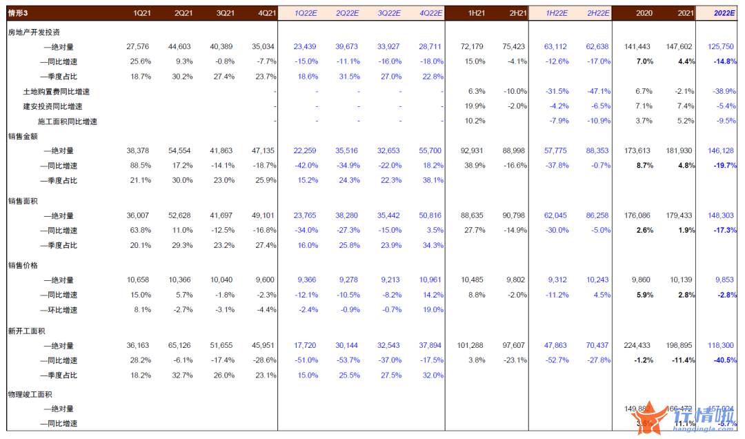 情形3:假设现行政策端在四季度方隐藏前述有力调节,则人们估计房地产(512200)销售市场景气度将直至四季度才隐藏拐点(同样因基数影响各指标可能再二、三季度隐藏同比下滑的收窄,但环比将突出弱于季节性表现,下滑的收小幅度度也将大幅弱于前两种情形)。此情形下估计全年销售面积-17%,销售金额-20%,投资额-15%,新开工面积-41%,物理竣工面积-6%。