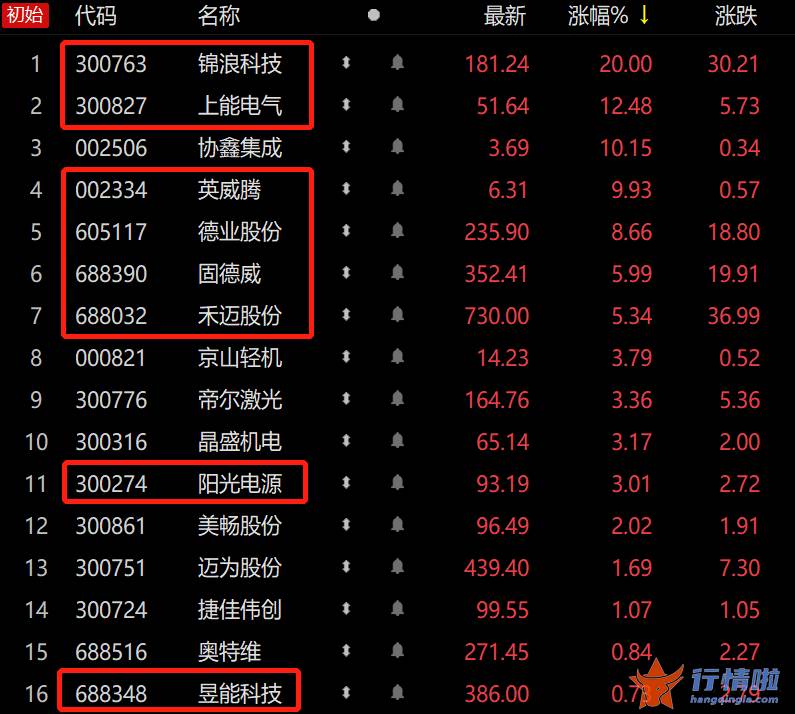 其中,锦浪科技(300763)跳空高开走强6.6%,20cm涨停封板;英威腾(002334)也一同涨停;上能电气涨超10%;德业股份收涨8.66%,盘中一度涨停;固德威、禾迈股份涨超5%;阳光电源(300274)、昱能股份等跟涨。今曰最新股市消息新闻