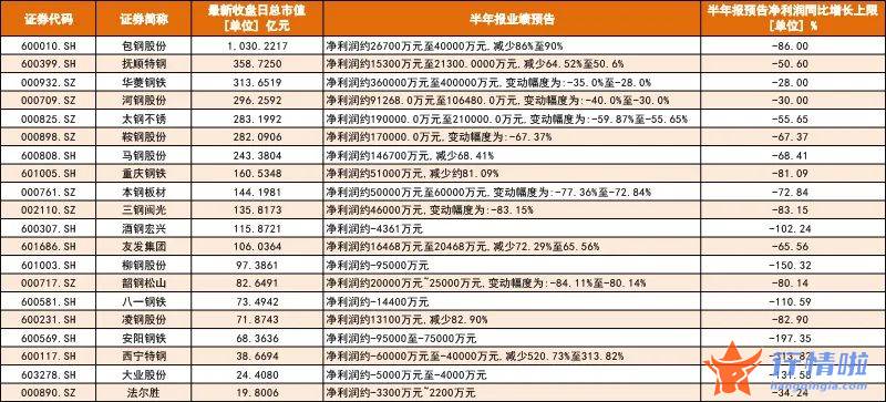 A股上市的钢铁企业竟无一预增。数据显示,今天12个股市要闻消息截至7月30日,20家A股钢铁企业已公布半年报业绩预告,这20家钢企均估计上半年归母净利润同比下降。其中,7家钢企估计上半年亏损。