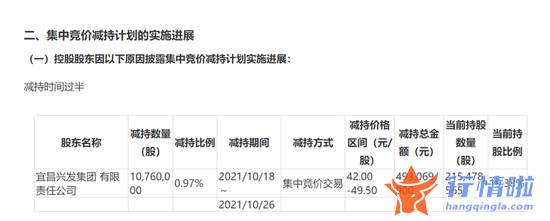 今年1月19日,兴发集团(600141)公告,公司于2021年9月15日披露了《湖北兴发化工集团股份有限公司关于控股股东减持股份计划公告》(公告编号:临2021-071),宜昌兴发因自身资金需求,拟通过集中竞价交易方式减持不超过公司总股本的1.20%,即不超过1342.67万股,减持期间为2021年10月18日至2022年4月18日。最终,宜昌兴发实际减持1076万股。